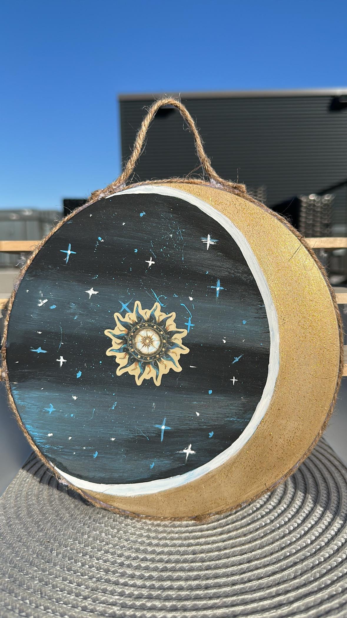 Bring the magic of dreams into your home with this unique, hand-painted double-sided wall hanging. Featuring a whimsical castle under a dreamy night sky, this fairytale-inspired piece is perfect for nursery rooms, boho bedrooms, or magical-themed spaces. Center image is decoupaged, surrounding artwork hand-painted with care. Framed in natural jute rope and secured with durable silicone adhesive. Lightweight and ready to hang. A one-of-a-kind decorative art piece made with love.
